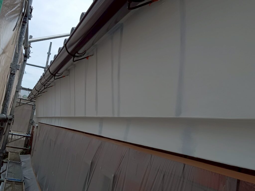 軒天と破風板も同じモルタル壁なので、同様に下塗りを塗装していきます。