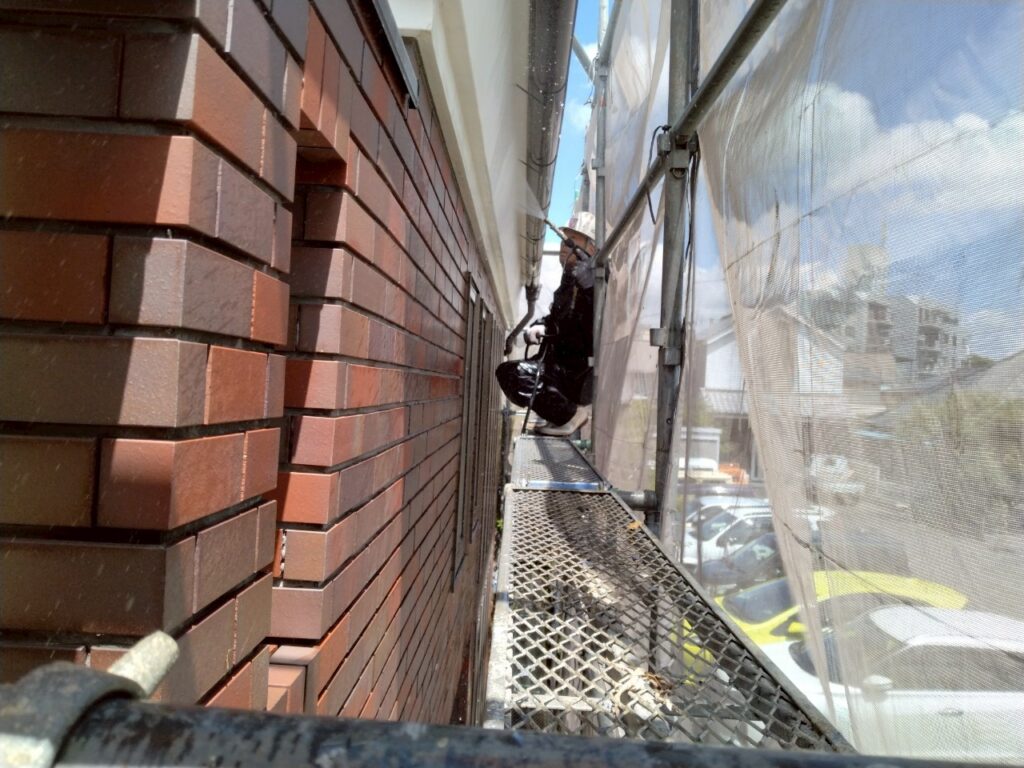 足場を組み立てた後に全体を高圧洗浄していきます。