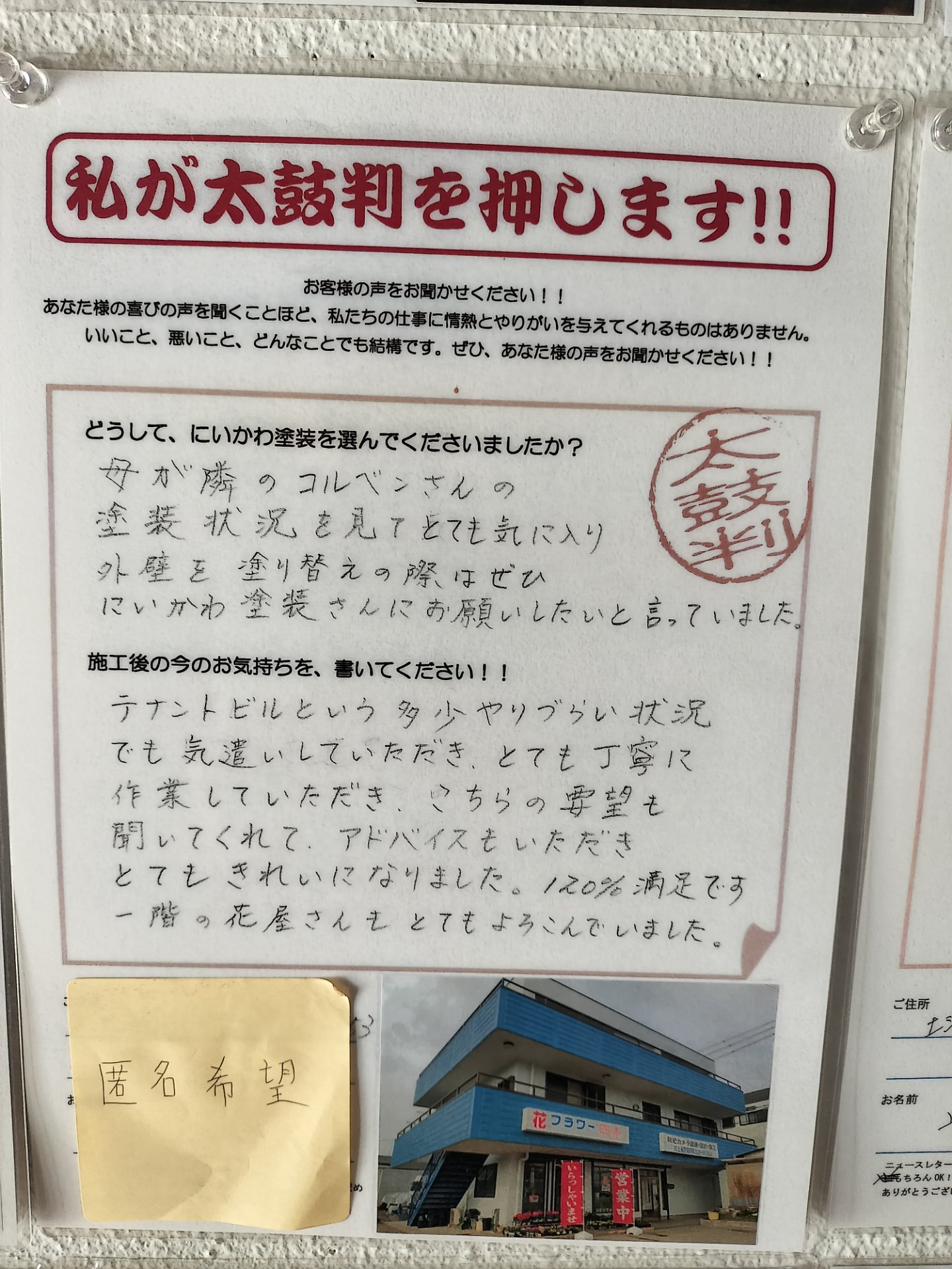 「代表の新川です。ありがとうございました。お隣様の建物を塗装している時から気にかけていただき、ありがとうございます!塗装をするならにいかわさんで!と言っていただいた時は嬉しかったです。色も鮮やかなブルーと白を掛け合わせ爽やかな印象になりました。仕上がりにもご満足いただけて職人一同喜んでいます。これからもお付き合いの程、よろしくお願いします。」