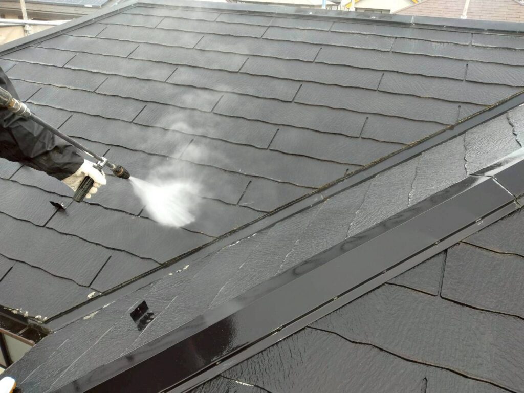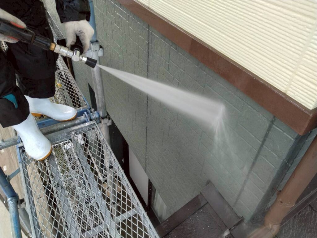 足場を組み立てた後に外壁を高圧洗浄していきます。
