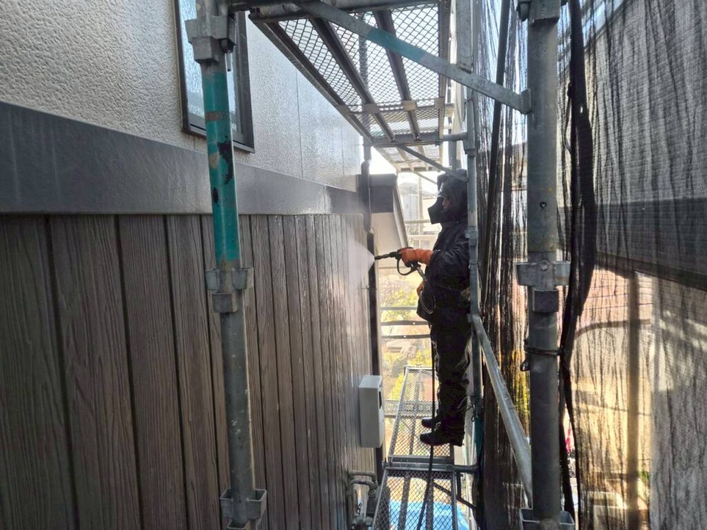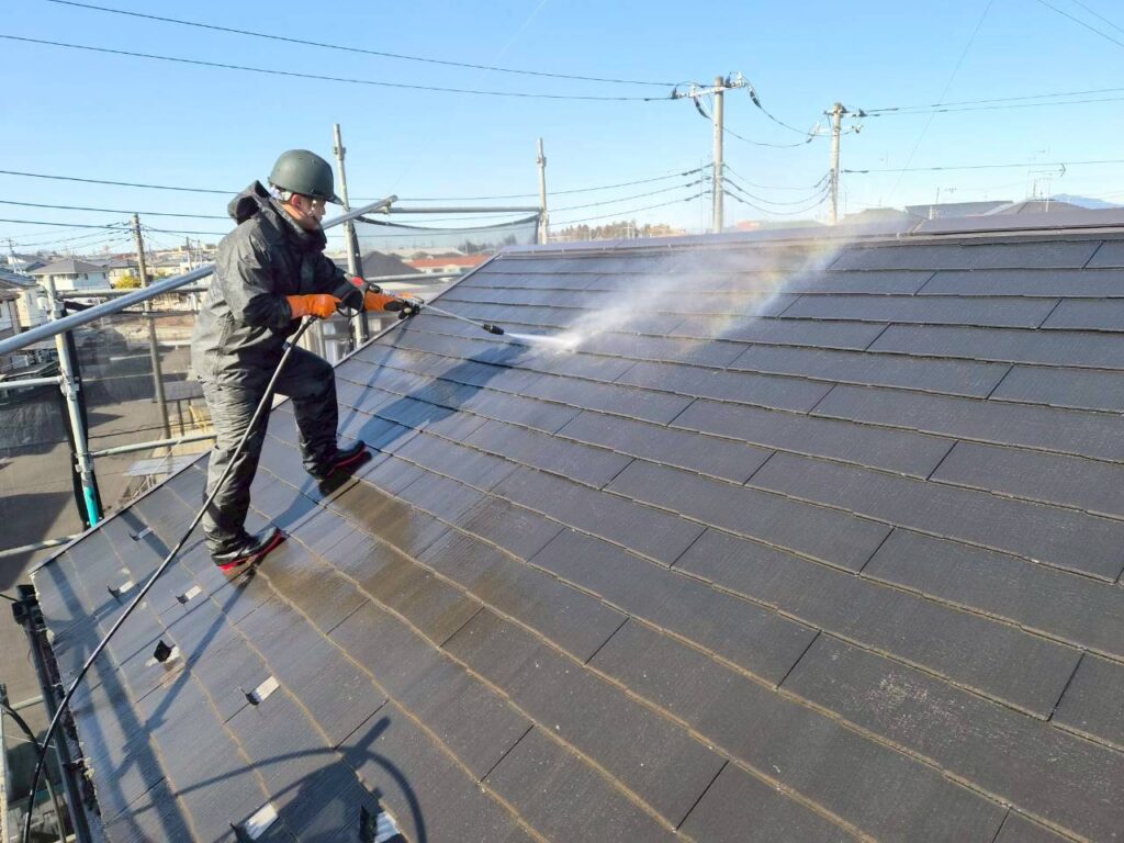 足場を組み立てた後に屋根や外壁を高圧洗浄していきます。