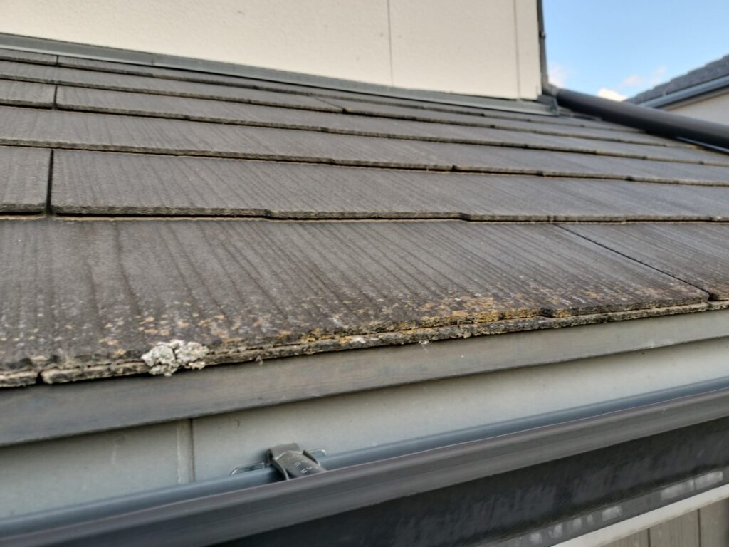 ↓ スレート屋根も劣化で退色し、コケも生えています。