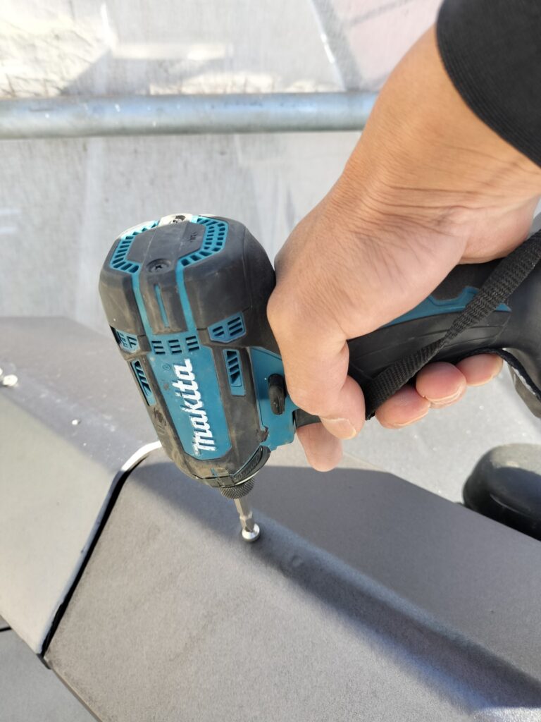 写真では、棟部分のビスが緩んでないか、インパクトドライバーで一つひとつ確認しています。