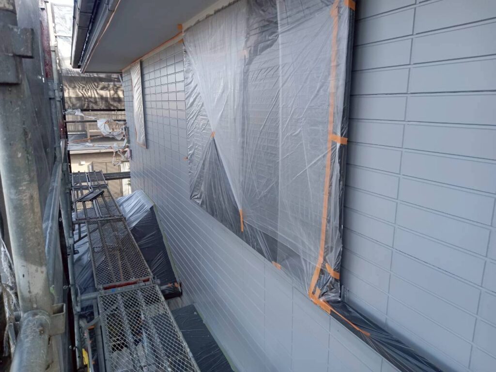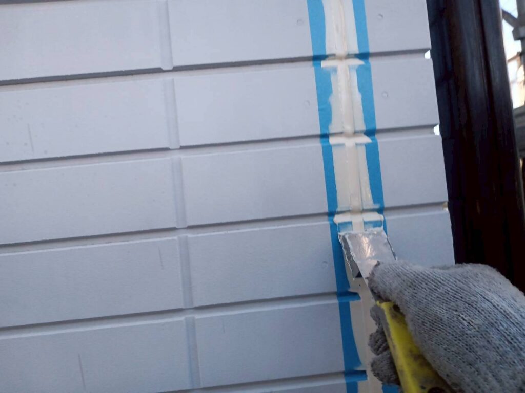 ↓ 古いコーキングを撤去してから、マスキングテープを貼ってコーキング専用プライマーを塗装します。