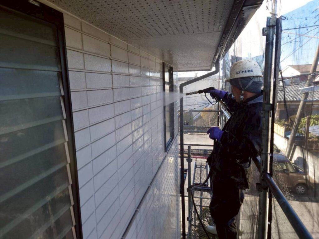 足場を組み立てた後に屋根や外壁を高圧洗浄していきます。