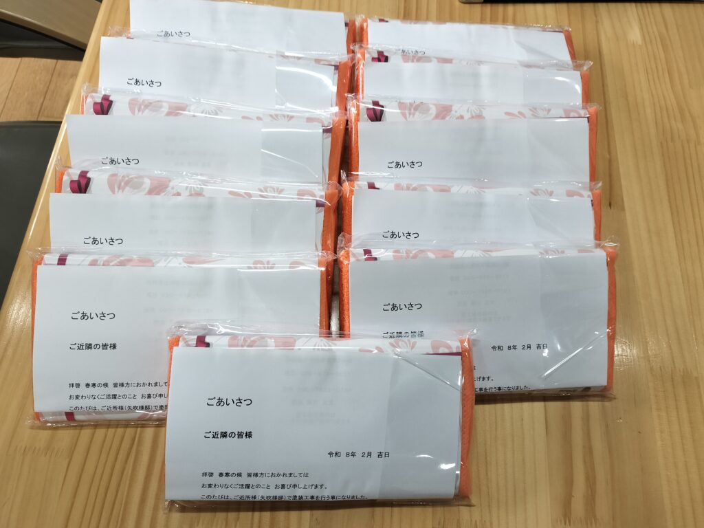 本日は、塗装工事開始の1週間ほど前に行う、ご近所様へのご挨拶を行いました。