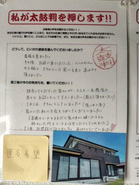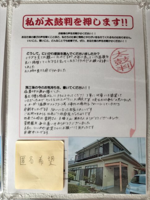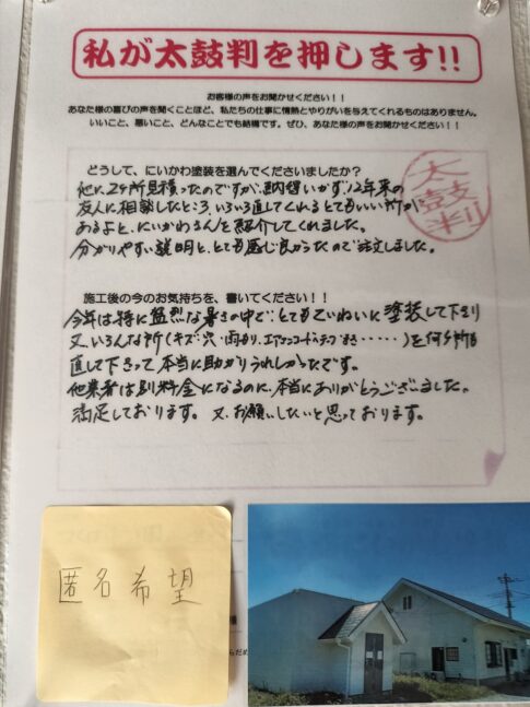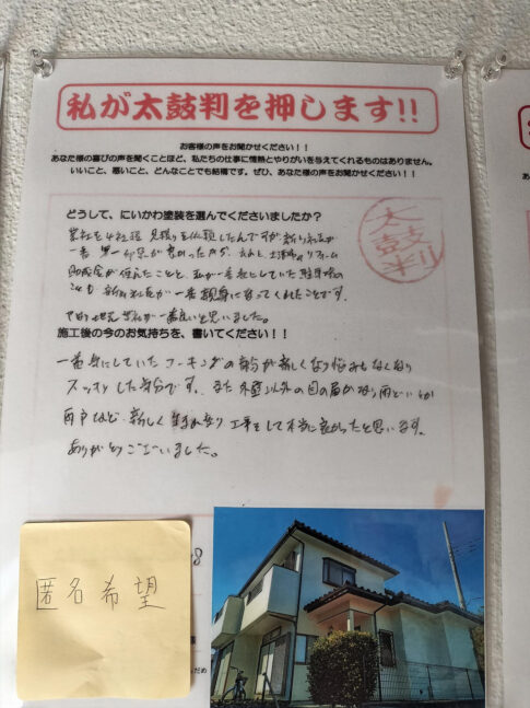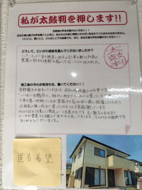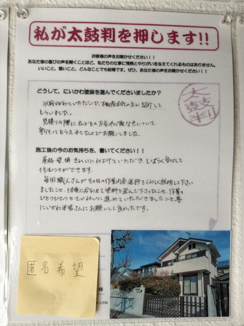 口コミ評判カスタマーレビュー ★★★★★ Q.どうして『にいかわ塗装』を選んでくれたのですか? 以前かかわっていただいた不動産会社の方に紹介してもらいました。見積りの際に私どもの不安や心配な点について寄り添ってもらえましたのでお願...