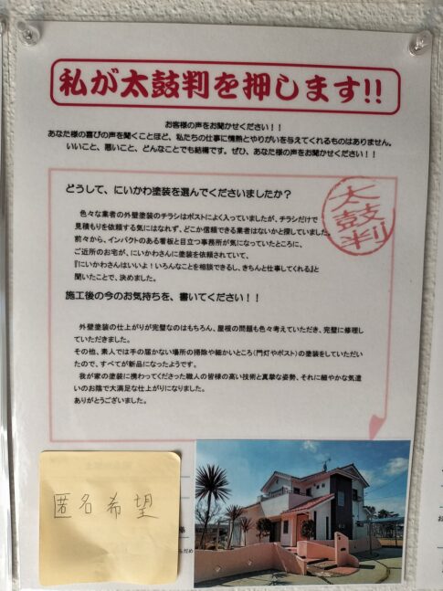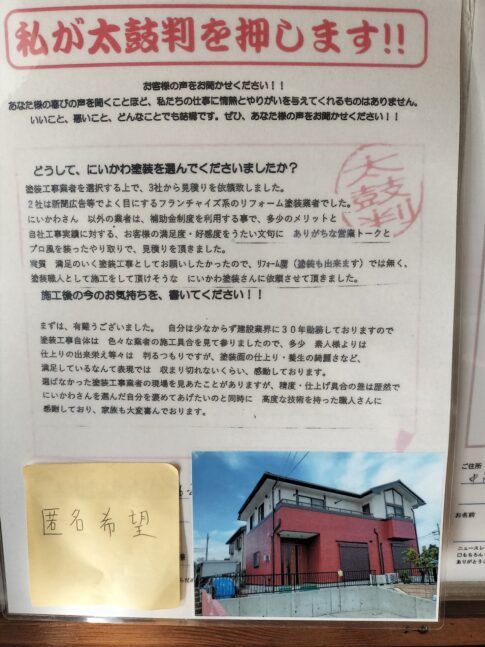 口コミ評判カスタマーレビュー ★★★★★ Q.どうして『にいかわ塗装』を選んでくれたのですか? ・看板を見ました。・その後、お話に来てくださった、にいかわさんの人柄と、きちんとした装いを見て選ばせて頂きました。 Q.今の気持ちを教...